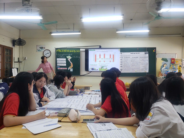 Giáo viên và học sinh lớp 12 trong giờ học Địa lí